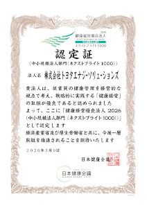 株式会社トヨタエナジーソリューションズは、2026年3月9日、経済産業省及び日本健康会議が主催する健康経営優良法人認定制度において、優良な健康経営を実践している企業として「健康経営優良法人2026」(中小規模法人部門(ネクストブライト1000))に認定されました。